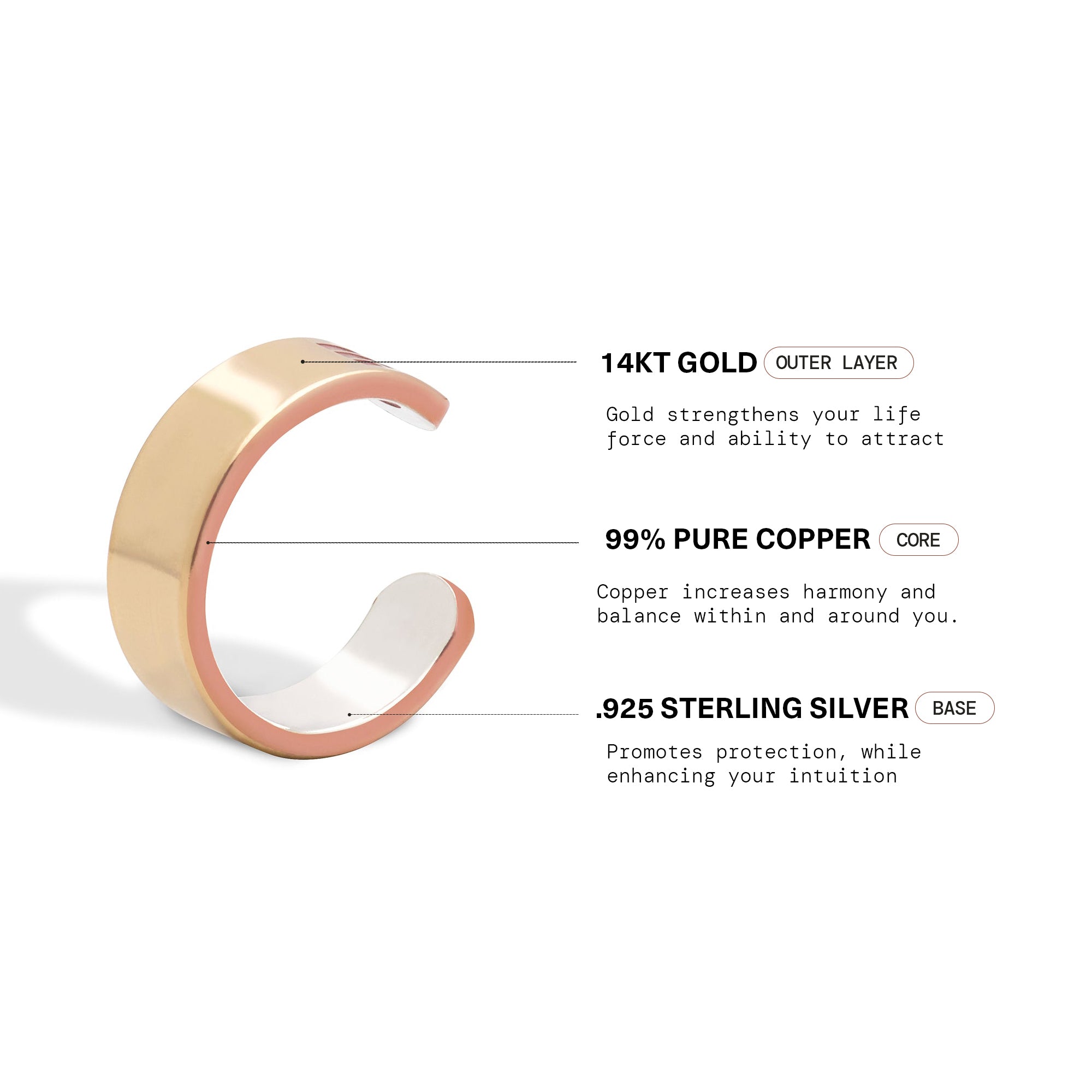 Our clean sterling silver sharpens your senses and shields you, pure copper increases harmony and balance, while clean 14k gold attracts positive energy.