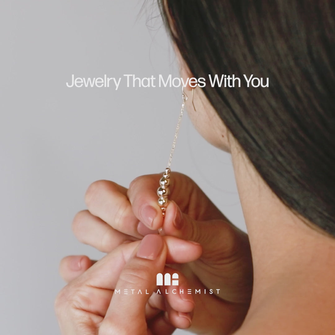 Linear Drops of our Adjustable Alchemy Beads. Slider beads allow you to space and group the precious metal beads exactly where you want them—adjustable to your style.