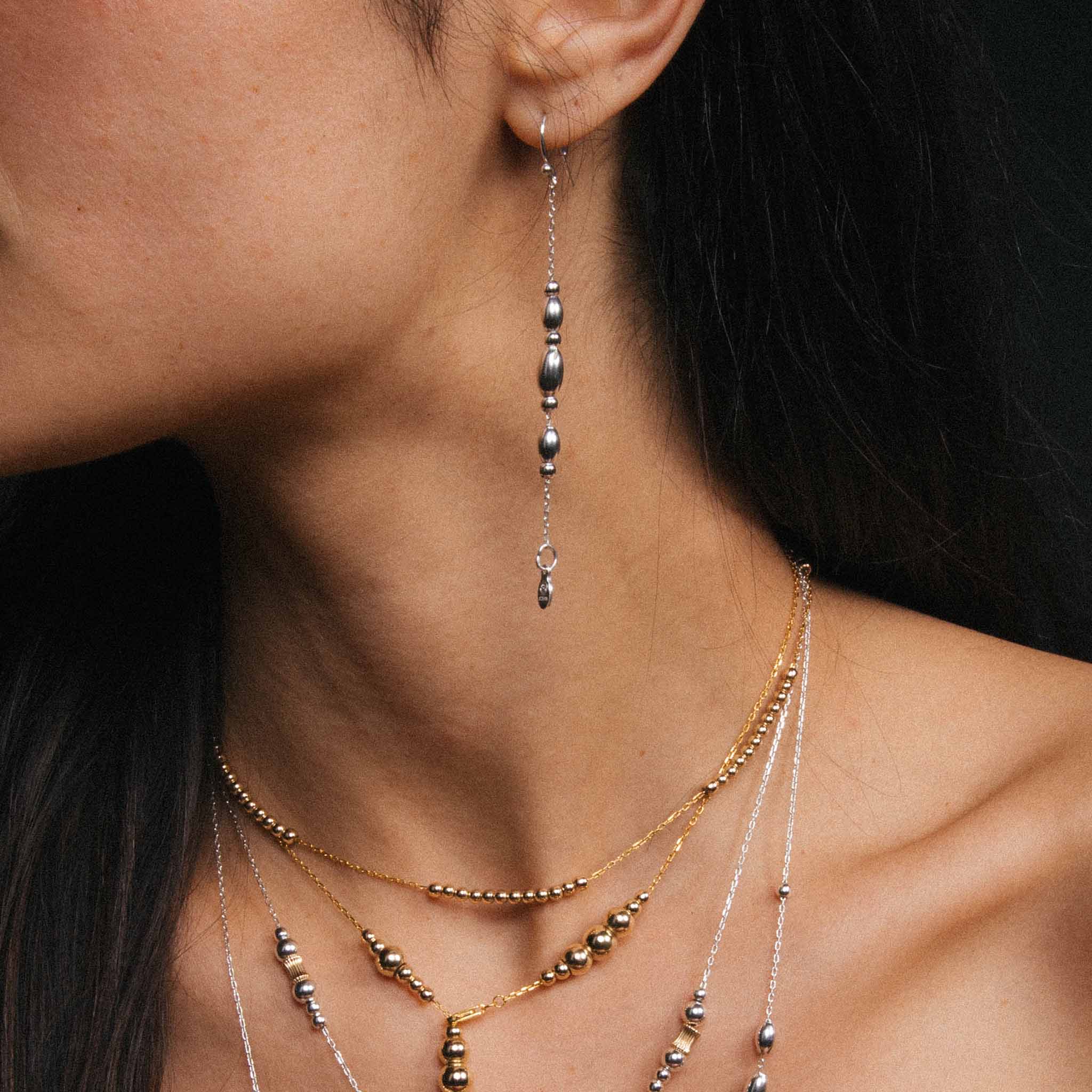 Linear Drops of our Adjustable Alchemy Beads. Slider beads allow you to space and group the precious metal beads exactly where you want them—adjustable to your style.