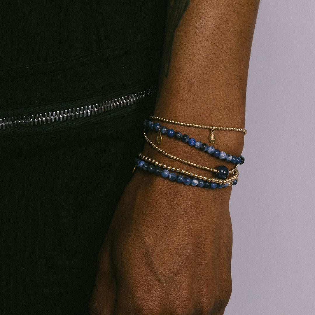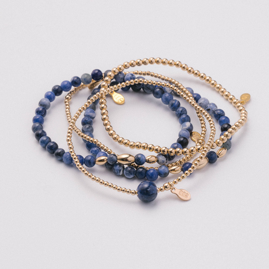 Blue Sodalite & 14kt gf beads are hand strung on high performance elastic to stretch comfortably over your wrist. A set of 5 bracelets